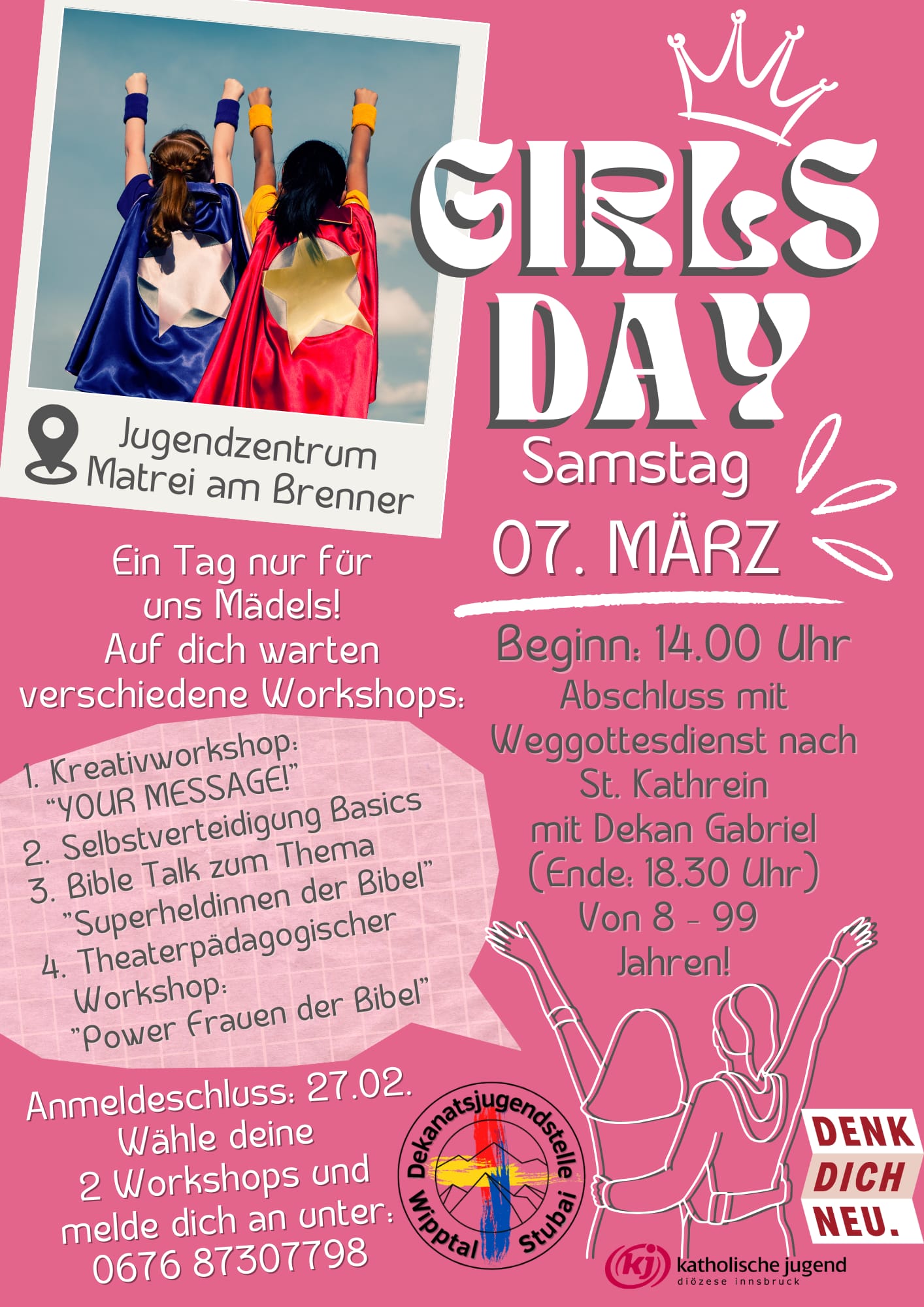 Wir laden alle Mädchen und Frauen im Alter von 8-99 Jahren ein, mit uns einen Tag zu verbringen! Bei coolen Workshops beschäftigen wir uns mit unterschiedlichen Themen. Als Abschluss feiern wir einen Weg-Gottesdienst, welcher uns zur Kirche in St. Kathrein führt, und schließen den Tag dort gemeinsam ab.