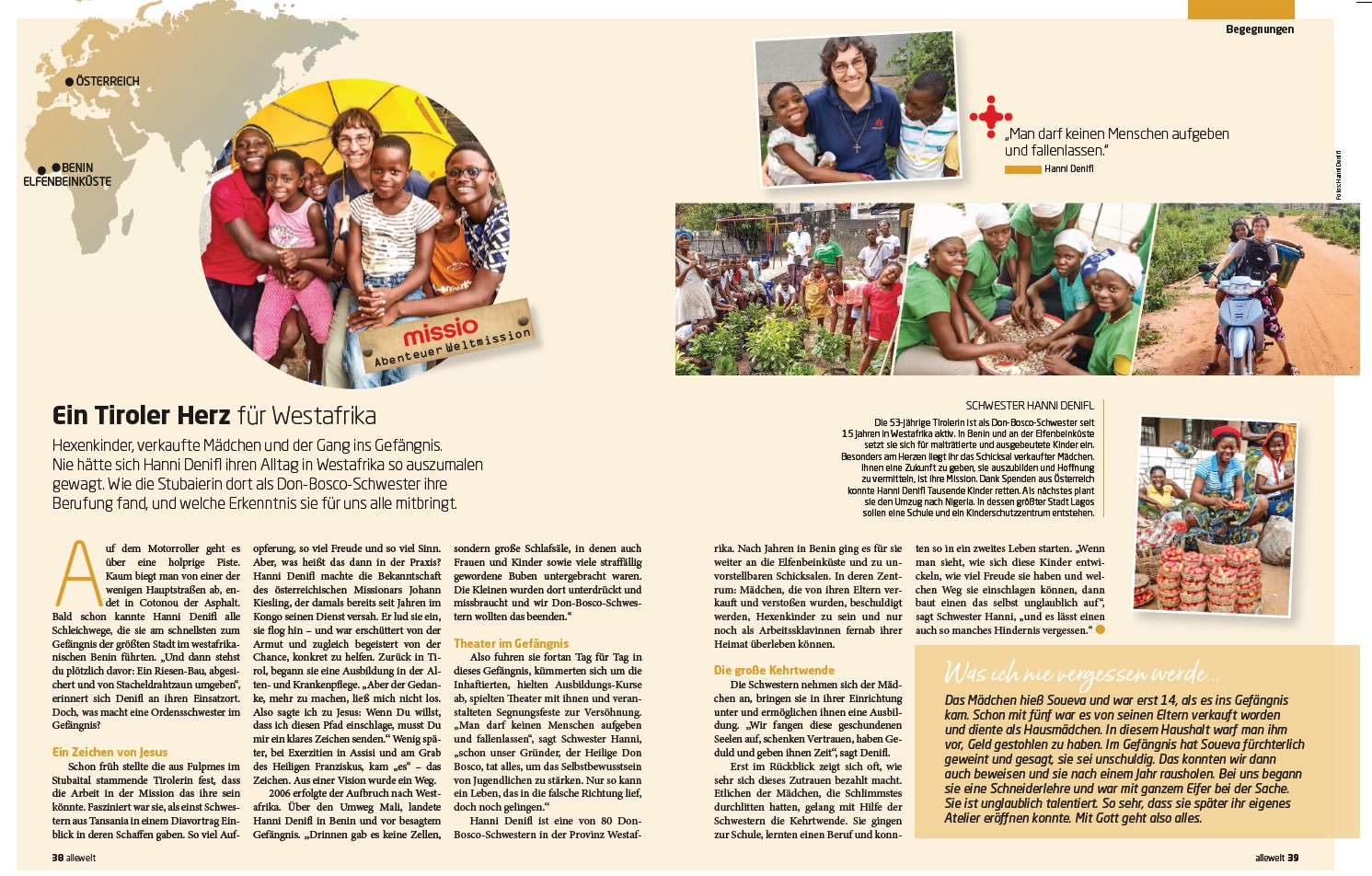 Was das konkret heißt, zeigt jede Ausgabe aufs Neue: Reportagen führen nach Afrika, Asien oder Südamerika und erzählen von Menschen, die ihren Glauben unter oft herausfordernden Bedingungen leben. „Wir sind auf der Suche nach Geschichten mit ganz viel Hoffnung“, wie allewelt-Chefredakteur Christoph Lehermayr betont. So etwa das Porträt der Tiroler Missionarin Hanni Denifl aus dem Stubaital, deren Einsatz in Benin eindrücklich und greifbar wird.