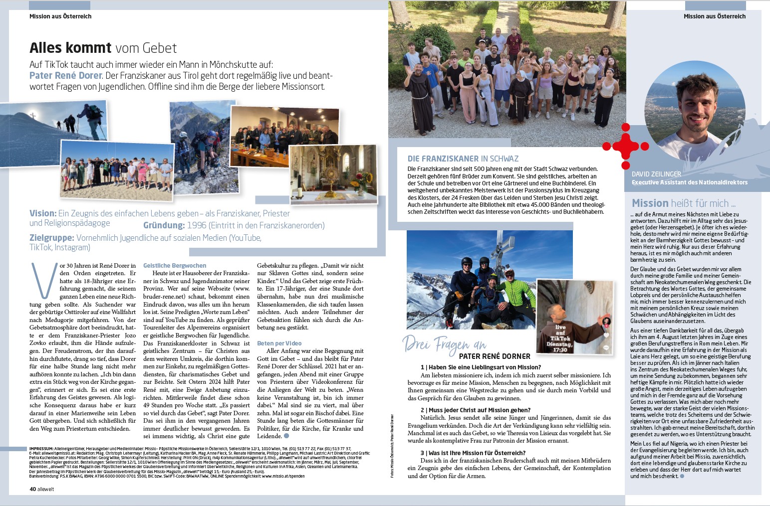 Gleichzeitig richtet die allewelt den Blick bewusst auf Tirol. Sie stellt Initiativen aus den Pfarren vor, macht Engagement sichtbar und gibt Menschen eine Stimme, die ihren Glauben konkret leben – etwa zuletzt dem Schwazer Franziskaner-Pater René Dorer. So entsteht eine Verbindung, die inspiriert: zwischen dem Leben vor Ort und der weltweiten Kirche.