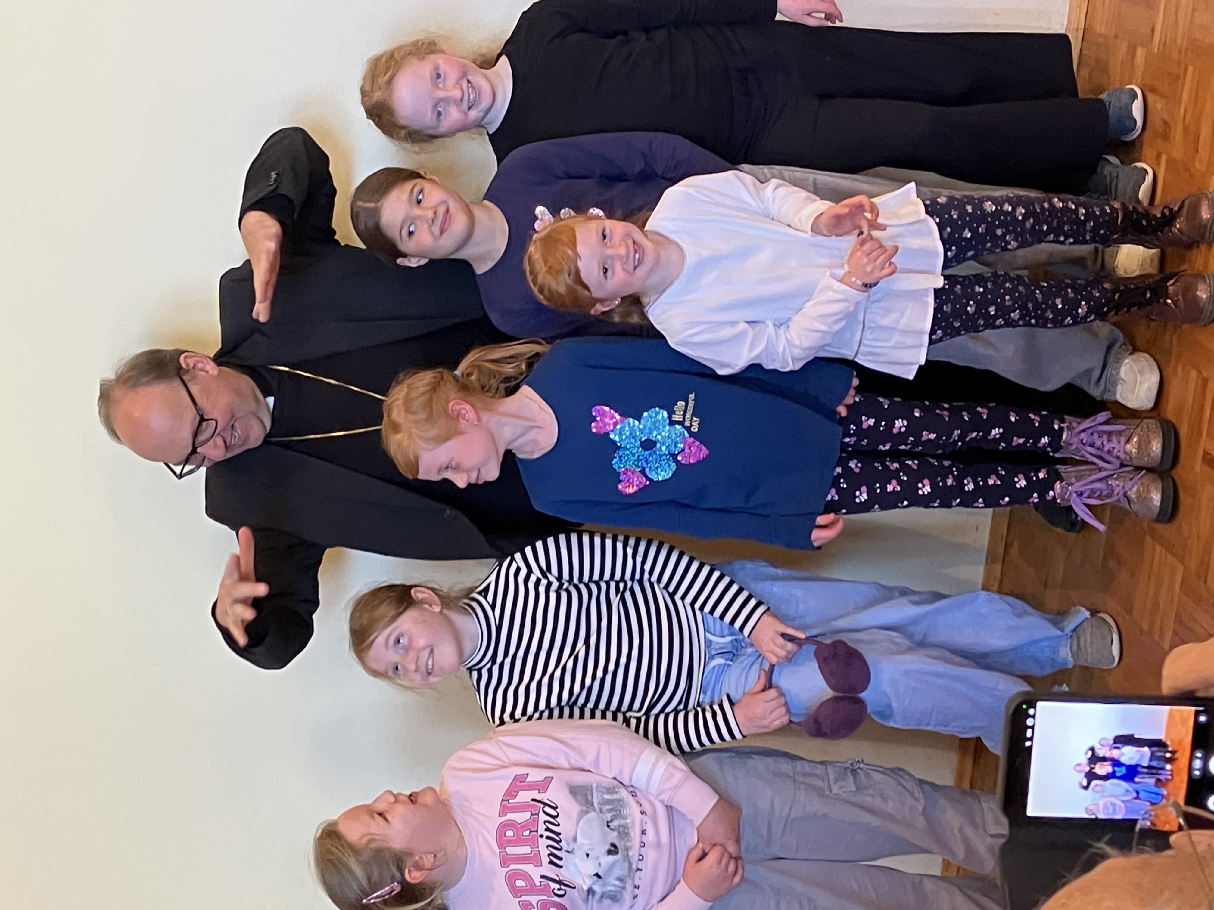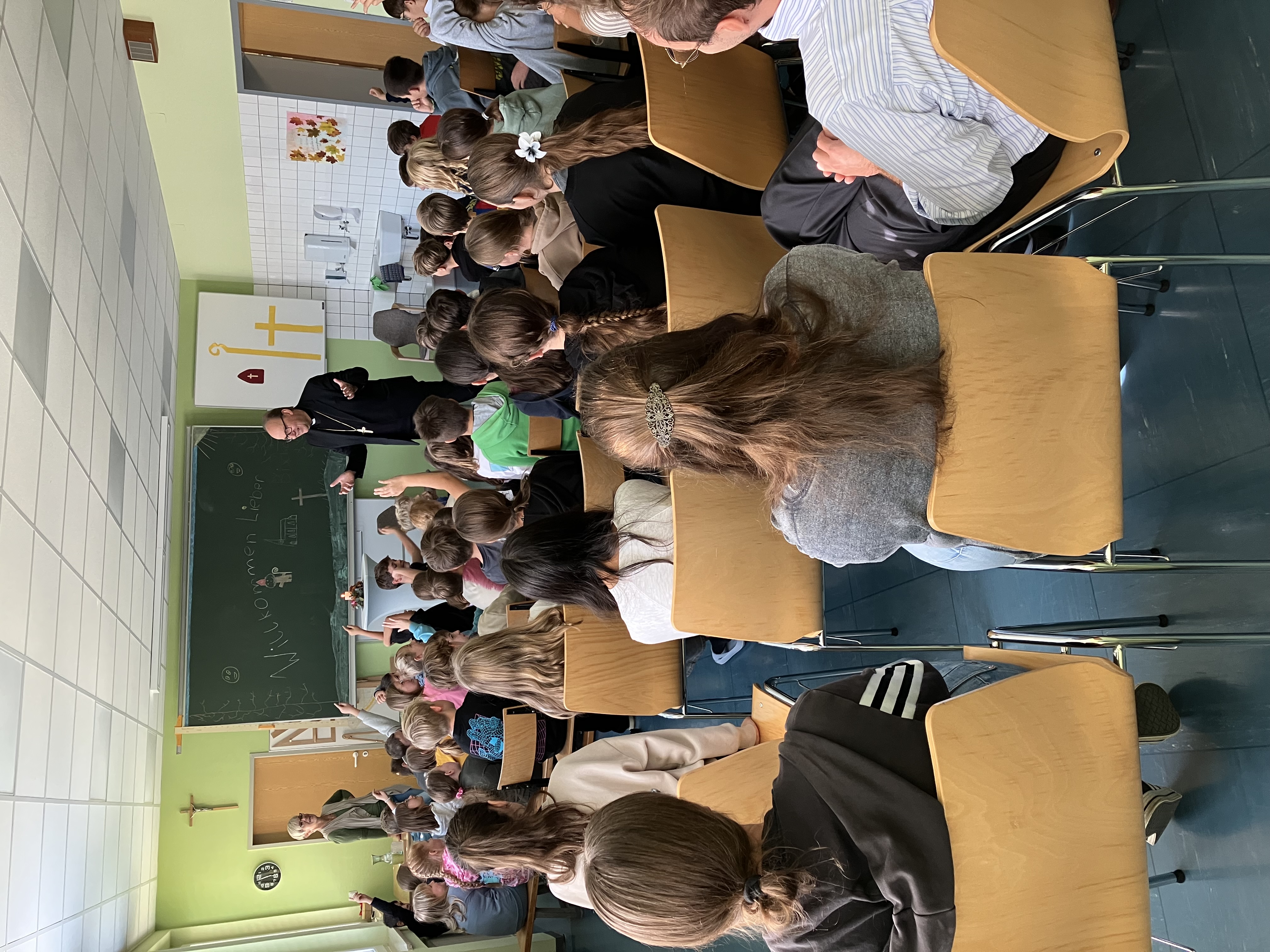 Die Kindergartenkinder interessierten sich besonders für die Insignien des Bischofs, also den Bischofsstab, die Mitra und das Kreuz und fragten ihn warum Löcher im Kreuz sind und im Bischofsstab eine Pfeffermühle eingebaut ist. „Damit man durch Jesus hindurch, die Menschen erkennt und niemanden übersieht“, erklärte ihnen Bischof Hermann. Auch sonst hatten die Kinder mit ihm einiges zu besprechen, bevor er die Schüler der einklassigen Volksschule besuchte, wo ihn zu den Fragen der Schüler und Schülerinnen eine besondere malerische Aufgabe erwartete.