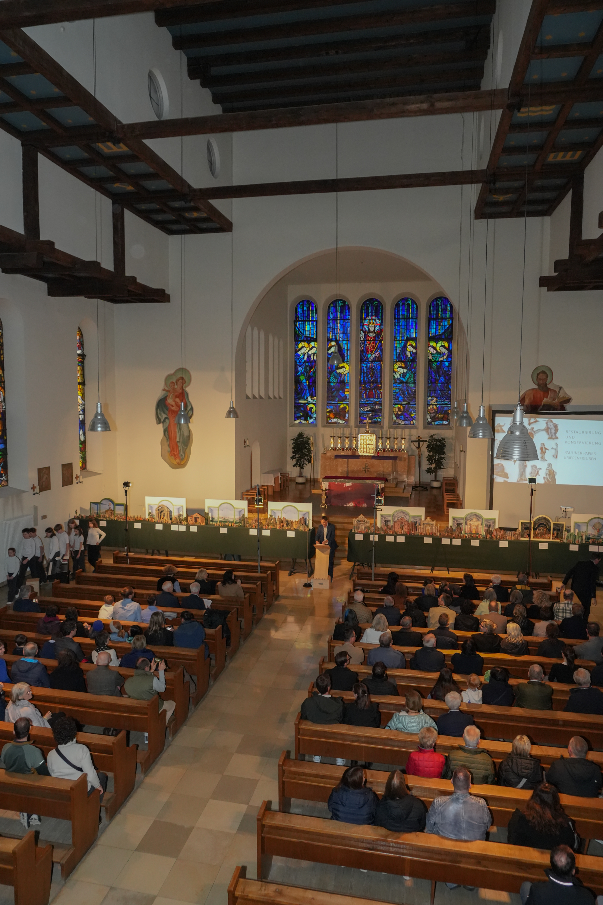 Die restaurierte Spätbarock‑Jahreskrippe des Paulinum Schwaz ist am Freitag, 20. März, im Rahmen einer öffentlichen Feier im Bischöflichen Gymnasium Paulinum der Öffentlichkeit vorgestellt worden. Zahlreiche Besucher:innen verfolgten die Präsentation der aufwendig konservierten Papierkrippe, die dem größtenteils dem Götzner Krippenmaler Georg Haller sowie auch dem Schwazer Krippenbauer Christoph Anton Mayr zugeschrieben wird. Die aus über 400 Einzelfiguren bestehende Ganzjahreskrippe bildet in 32 Szenen den gesamten kirchlichen Festkreis ab – von Advent und Weihnachten über die Passionszeit bis zu Pfingsten und Mariä Himmelfahrt.