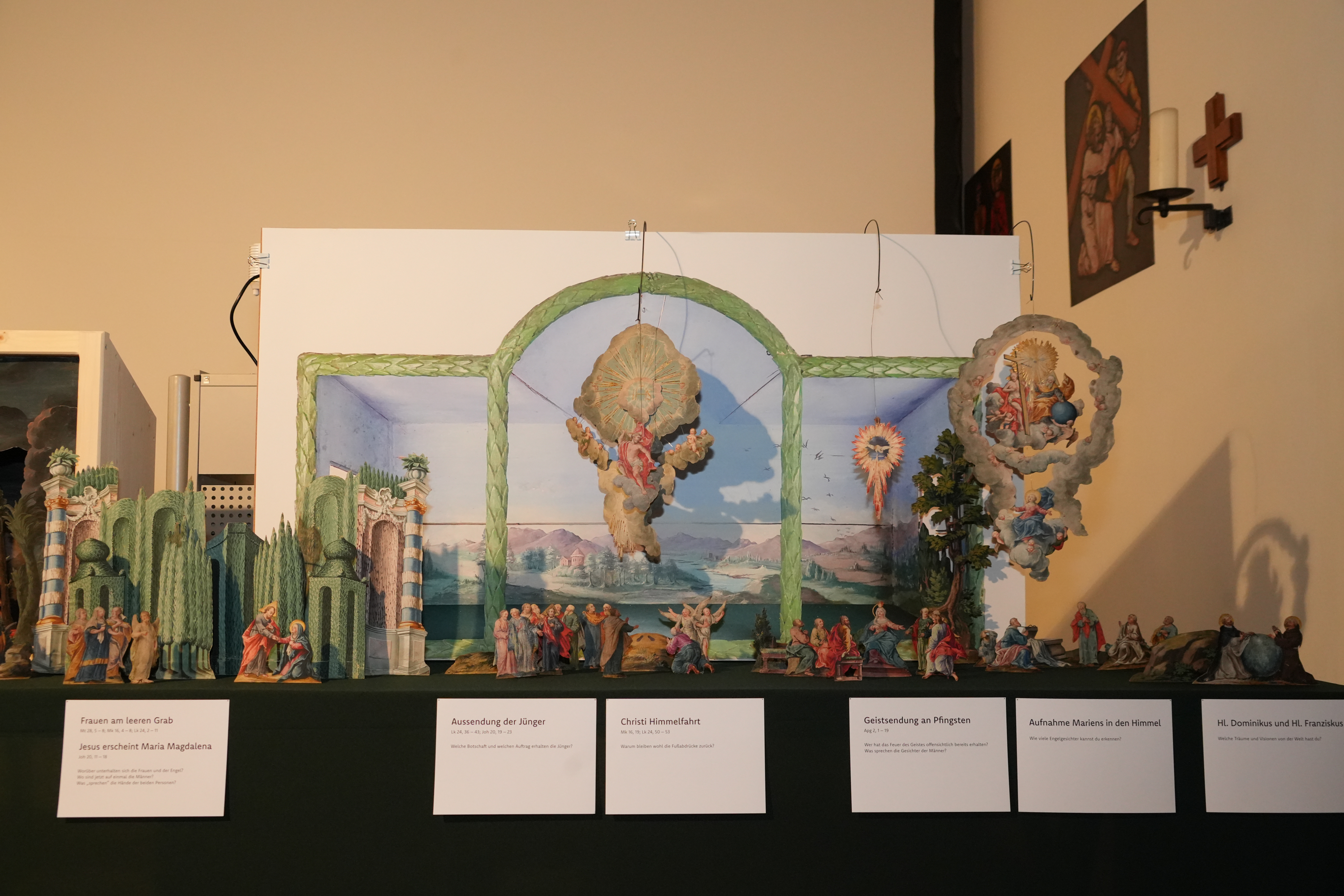 Die neue Ausstellungsgestaltung ermöglicht eine klare Übersicht über die 32 Szenen und ihre theologischen Bezüge. Ergänzende Hinweise erläutern Ikonografie, Entstehungszeit und Zuschreibung. Besonderen Wert legten die Projektpartner:innen auf reversible Maßnahmen und eine klimaangepasste Präsentation, um die empfindlichen Papierobjekte dauerhaft zu schützen.