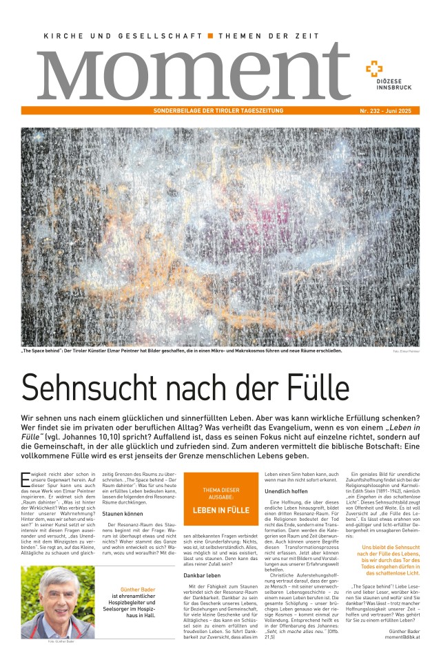 Moment heißt die Beilage der Diözese Innsbruck in der Tiroler Tageszeitung. Sie erscheint einmal im Monat und behandelt gesellschaftliche, soziale und kulturelle Fragen aus kirchlicher Sicht. Die redaktionelle Verantwortung für die vierseitige Beilage liegt beim Zentralen Dienst Kommunikation und Öffentlichkeitsarbeit der Diözese Innsbruck. Moment erscheint jeweils gegen Ende des Monats und kann hier als PDF zum Nachlesen heruntergeladen werden.